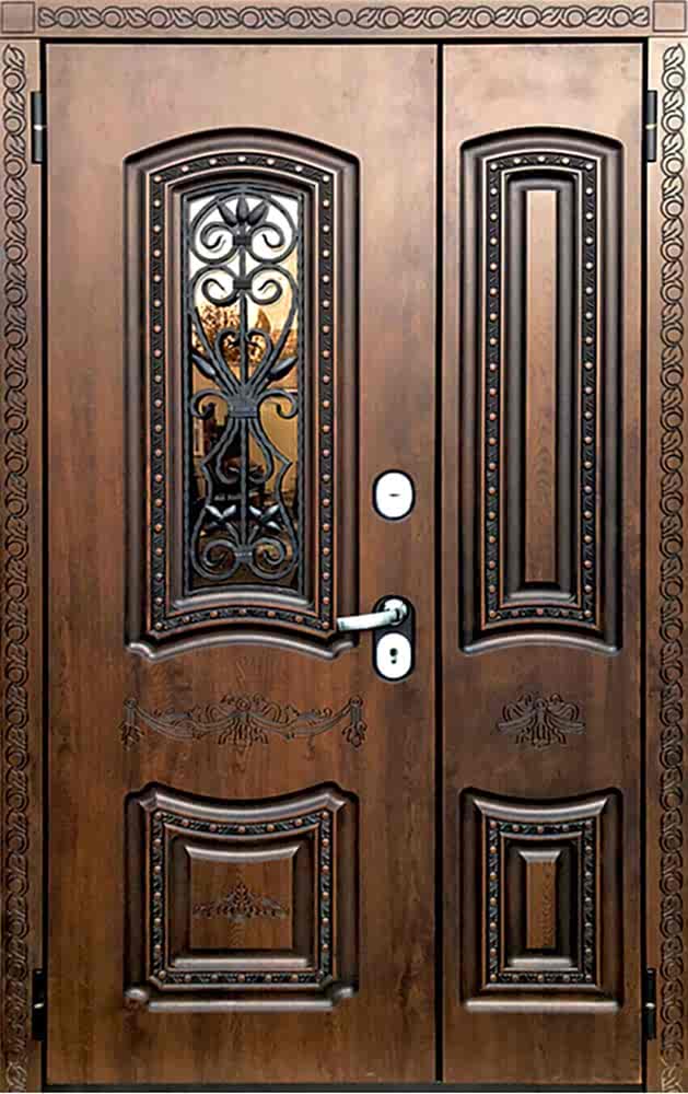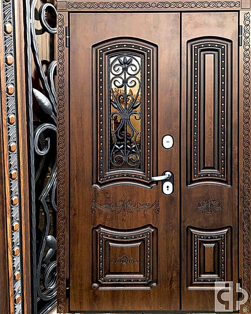 Компания «Мир Дверей» предлагает металлические входные двери собственного производства «FARAON» (производство г. Йошкар-Ола).Эксклюзивная двухпольная модель «Эксклюзив 5» разработана под широкий проем. Конструкция имеет две разноразмерные активные створки. Полотно теплоизолировано базальтовой плитой. Два контура уплотнения препятствуют сквознякам, проникновению внутрь пыли и запахов. В отделке использованы объемные панели МДФ с защитным покрытием Винорит, остекление, кованая решетка. Дверь комплектуется замком KALE.