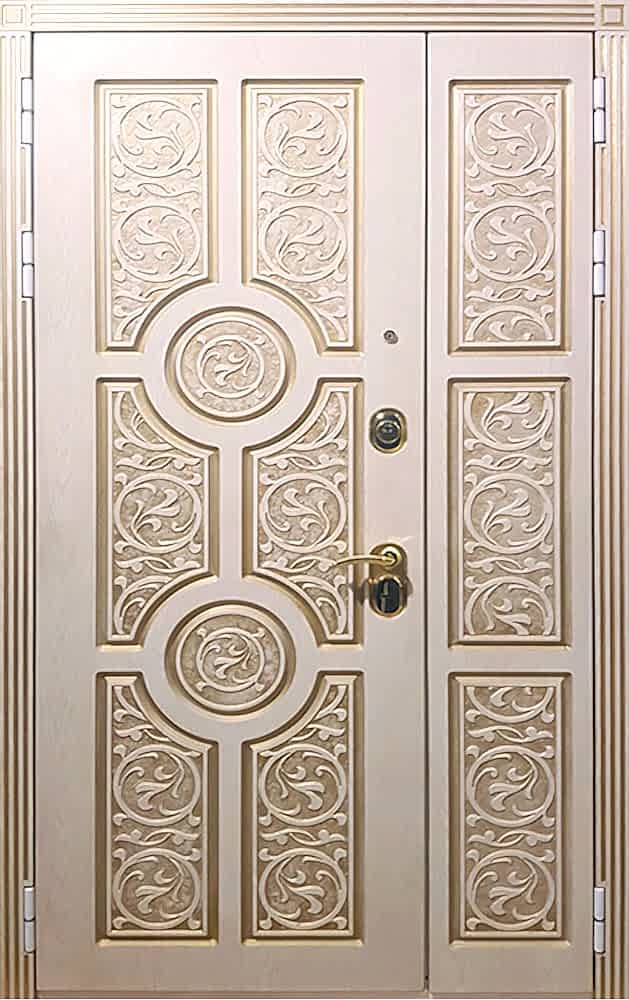 Компания «Мир Дверей» предлагает металлические входные двери собственного производства «FARAON» (производство г. Йошкар-Ола).Эксклюзивная двухпольная модель «Эксклюзив 6» разработана под широкий проем. Конструкция имеет две разноразмерные активные створки. Полотно теплоизолировано базальтовой плитой. Два контура уплотнения Pin Up сквознякам, проникновению внутрь пыли и запахов. В отделке использованы объемные панели МДФ с защитным покрытием Винорит, остекление, кованая решетка. Дверь комплектуется замком KALE.