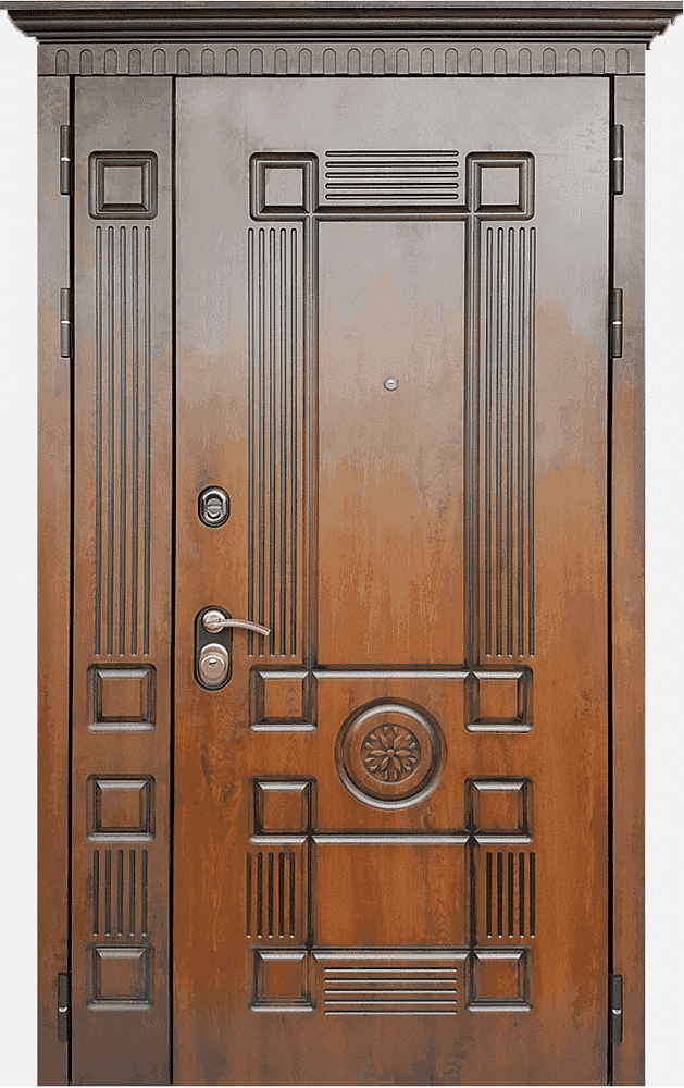 Компания «Мир Дверей» предлагает металлические входные двери собственного производства «FARAON» (производство г. Йошкар-Ола).Эксклюзивная двухпольная модель «Эксклюзив 8» разработана под Pin Up проем. Конструкция имеет две разноразмерные активные створки. Полотно теплоизолировано базальтовой плитой. Два контура уплотнения препятствуют сквознякам, проникновению внутрь пыли и запахов. В отделке использованы объемные панели МДФ с защитным покрытием Винорит, остекление, кованая решетка. Дверь комплектуется замком KALE.