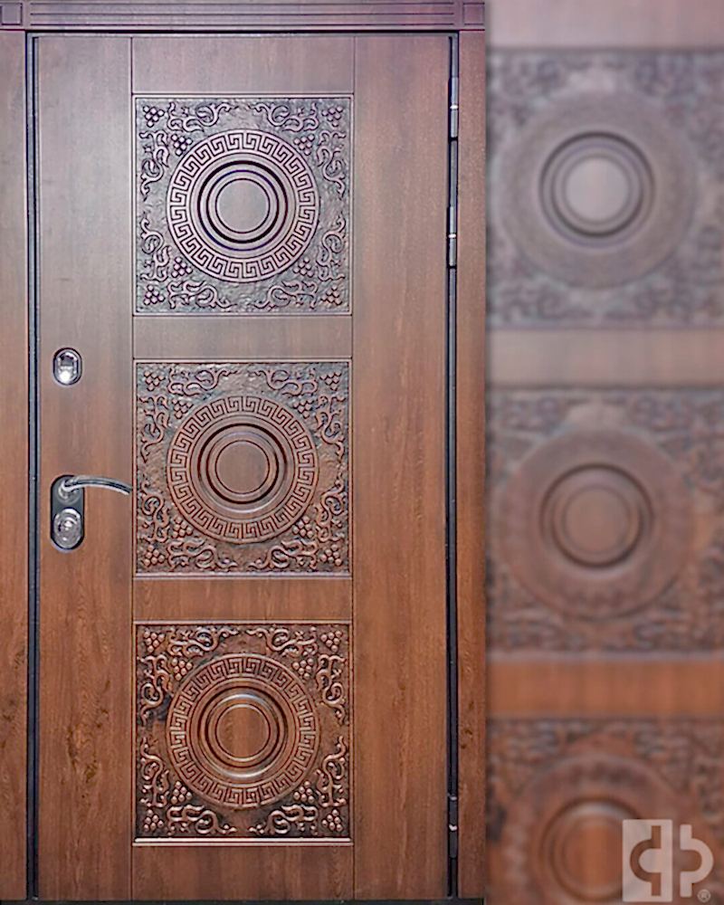 Компания «Мир Дверей» предлагает металлические входные двери собственного производства «FARAON» (производство г. Йошкар-Ола).Модель «Круг» изготовлена из металлопрофиля и стального листа. Полотно толщиной 96 мм теплоизолировано базальтовой плитой. Двухконтурное уплотнение препятствует сквознякам, проникновению пыли и запахов. Полотно навешено на шарикоподшипниковые петли. В отделке Pin Up влагостойкие фрезерованные накладки МДФ, защищенные от атмосферных и механических воздействий пленкой Винорит. Дверь комплектуется замками Гардиан 3011 и 3201.