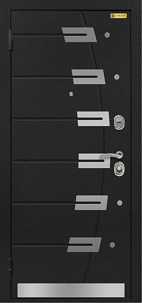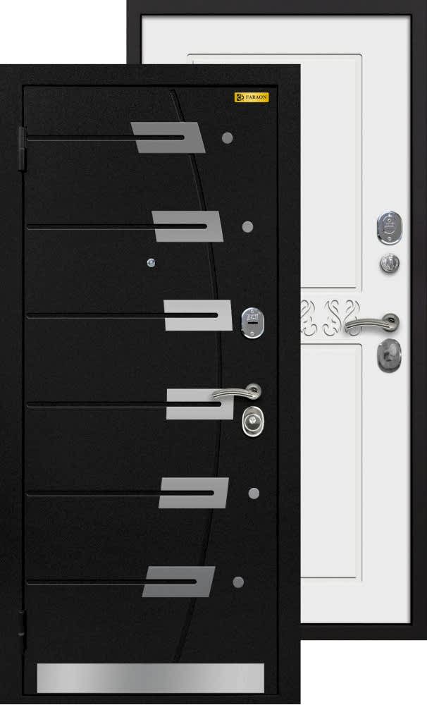 Компания «Мир Дверей» предлагает металлические входные двери собственного производства «FARAON» (производство г. Йошкар-Ола).Модель «Рояль» изготовлена из металлопрофиля и стального листа. Полотно толщиной 75 мм теплоизолировано базальтовой плитой. Двухконтурное уплотнение препятствует сквознякам, проникновению пыли и запахов. Полотно навешено на шарикоподшипниковые петли. Снаружи дверь облицована декоративной панелью со вставками из нержавейки, с внутренней стороны установлена накладка из МДФ. Дверь комплектуется Pin Up Гардиан 3011 и 3201.